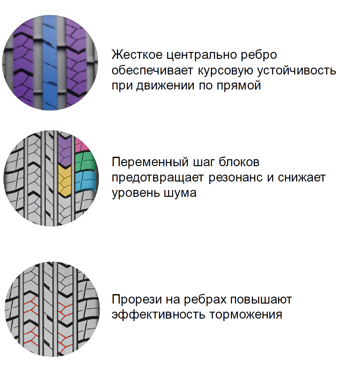- Курсовая устойчивость — симметричный ненаправленный рисунок протектора представлен несколькими жёсткими рёбрами, которые оказывают поддержку во время длительных поездок по трассе, непрерывно стабилизируя движение.