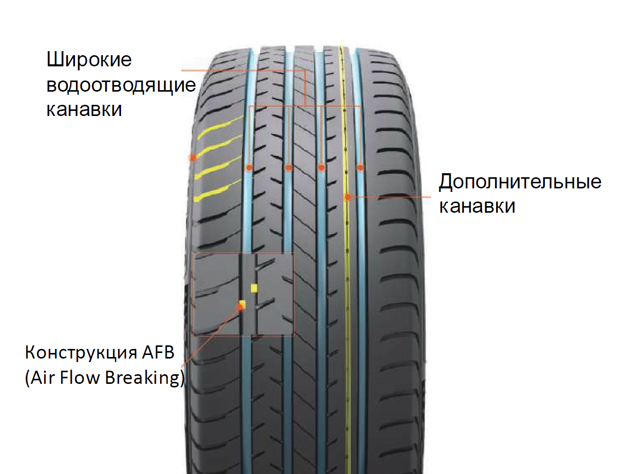 Технология AFB (Air Flow Breaking) снижает шум за счет нарушения воздушных потоков в зоне контакта шины с дорогой, делая поездку более комфортной. - Износостойкость и ресурс