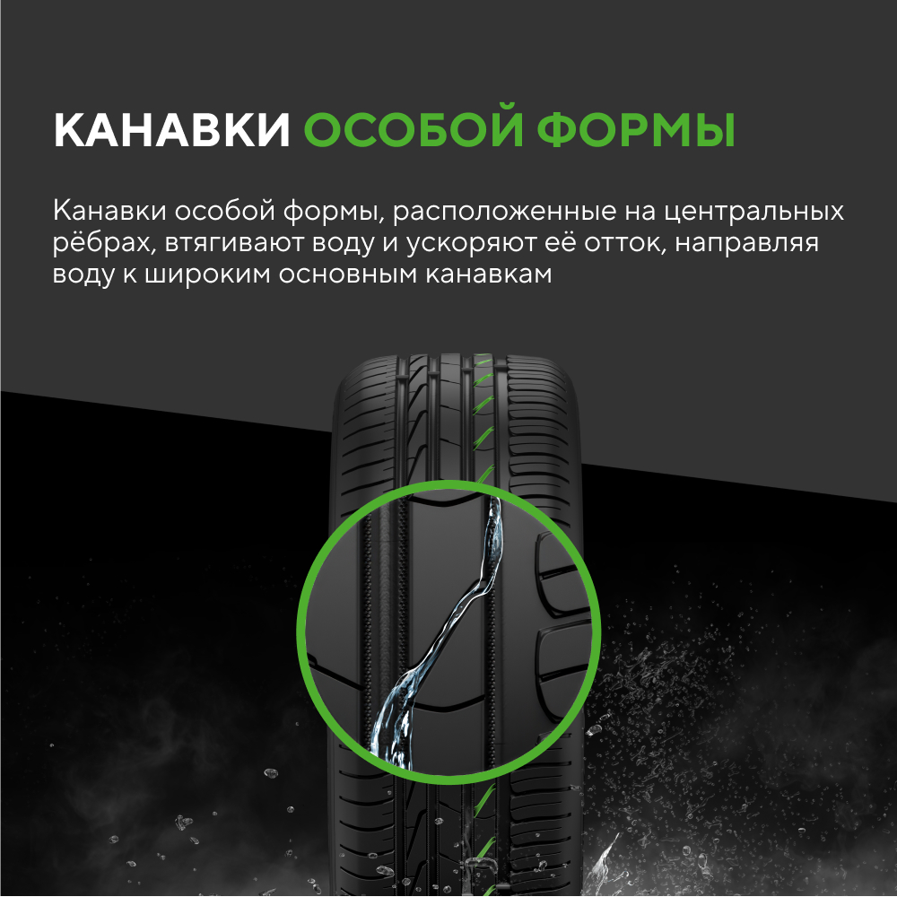 - Инновационная конструкция шашек во внутренней плечевой зоне эффективно направляет поток воды в поперечные канавки, ускоряя ее отведение и снижая риск аквапланирования.