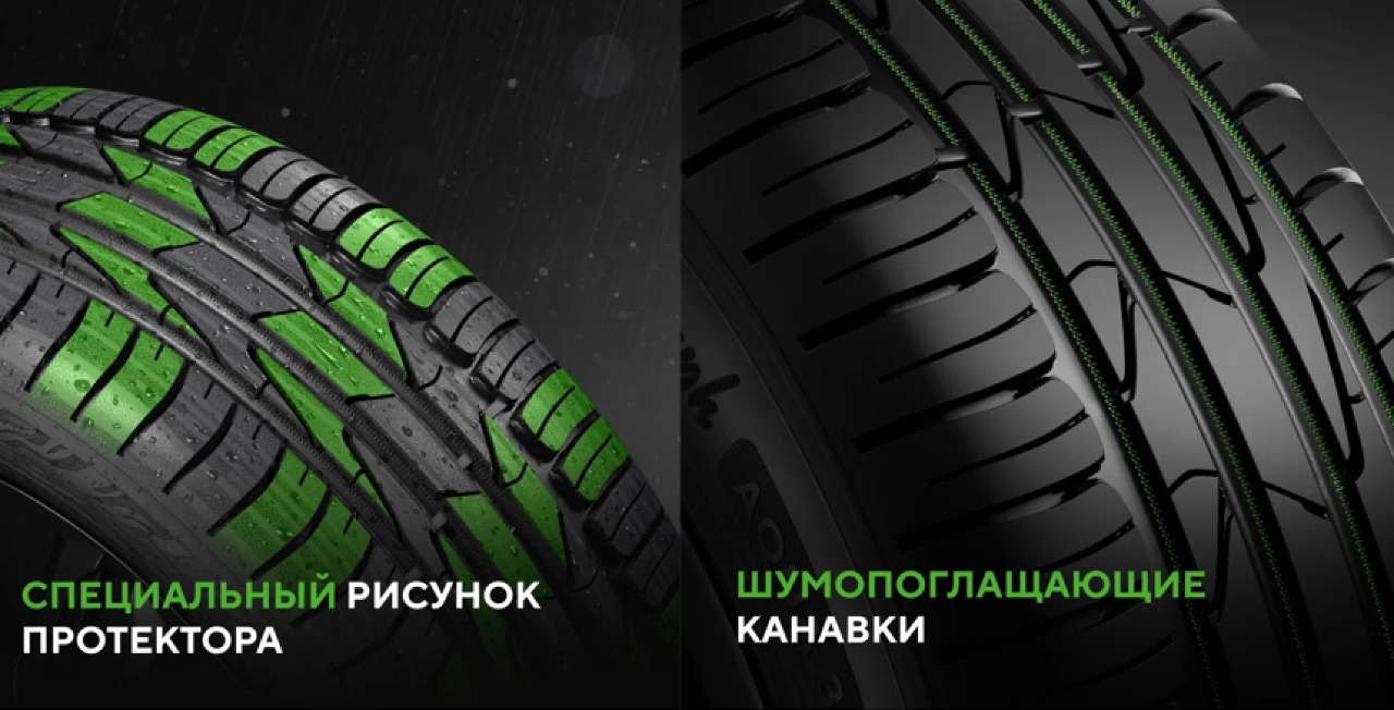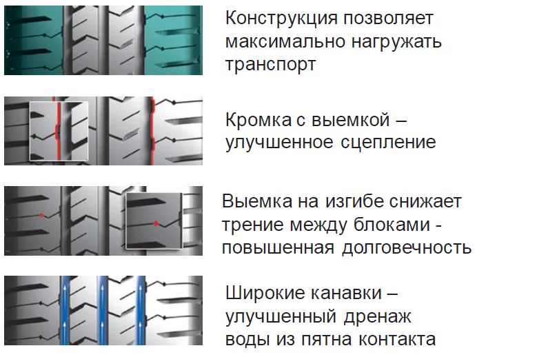 - Дополнительная тишина в салоне достигается благодаря специальному рисунку протектора и особой расстановке шашек, предотвращающей эффект резонанса.