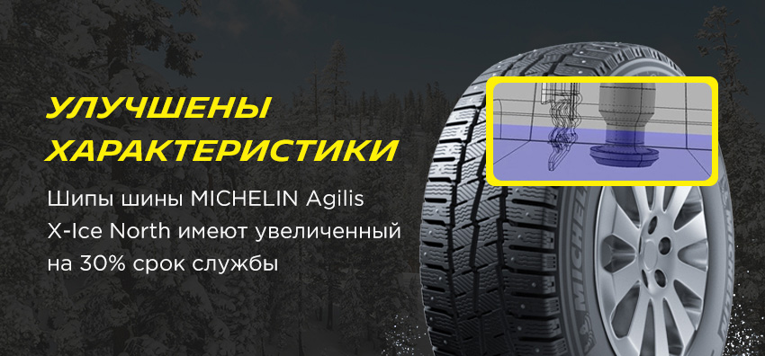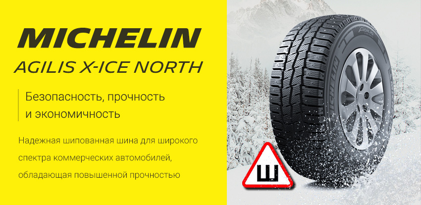 Зимние шипованные шины для микроавтобусов и легких грузовиков MICHELIN Agilis X-Ice North. Обозначение X-Ice говорит нам, что шина скандинавского типа и предназначена для суровых зимних условий, а приставка North - о наличии шипов в протекторе. Agilis X-Ice North является продолжением и развитием модели Agilis 81 Snow Ice и обладает улучшенным на 25% сцеплением на снегу.