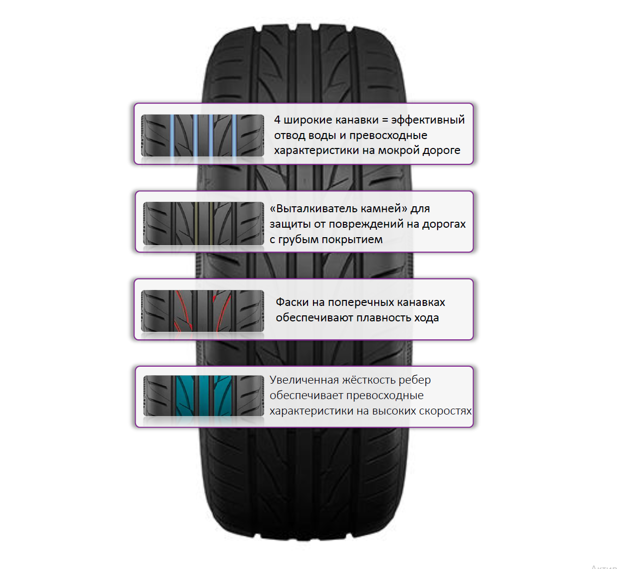 Жёсткое центральное ребро повышает курсовую устойчивость и точность рулевых реакций на высокой скорости. Охлаждающие элементы в протекторе способствуют более равномерному распределению температуры, а встроенные камнеотводы помогают сохранять стабильность характеристик при движении по неровным дорогам.