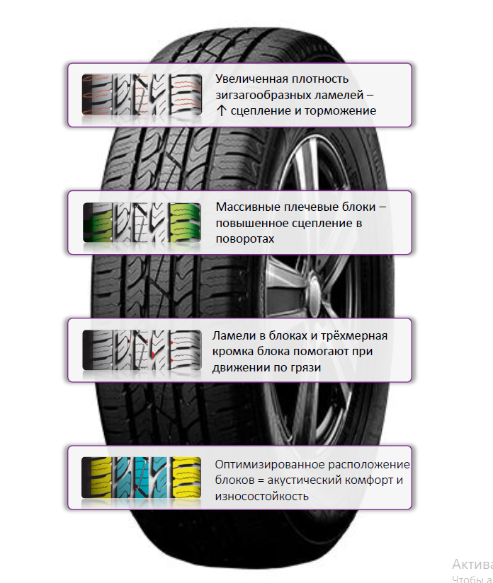 Зигзагообразные ламели способствуют более эффективному торможению, а открытая внешняя плечевая зона помогает при движении по грунтовым дорогам. Многослойная структура протектора снижает шум и способствует равномерному износу.