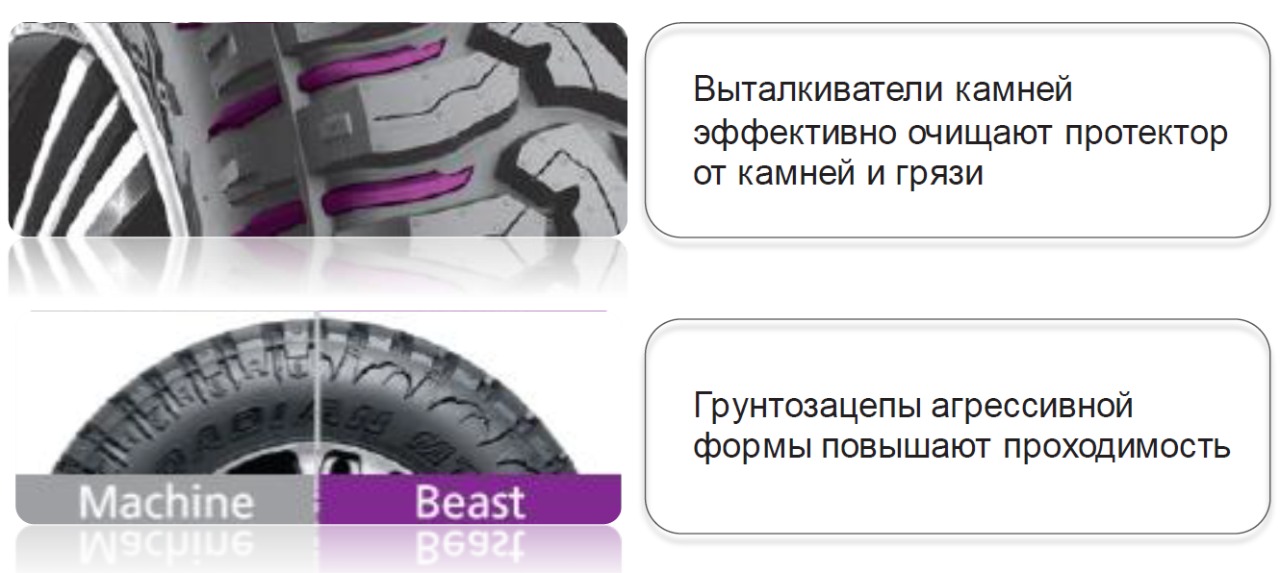 Конструкция шины выдерживает высокие динамические нагрузки, защищает от проколов и ударов на камнях и кочках и снижает риск повреждений при езде по жёсткому бездорожью.